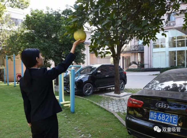 原來,為了“雙童”的生態(tài)和美觀,公司明確柚子是觀賞性水果,每棵柚子樹上都有“觀賞水果,請(qǐng)勿摘食”的字樣,提醒和引導(dǎo)員工不要摘食觀賞水果。