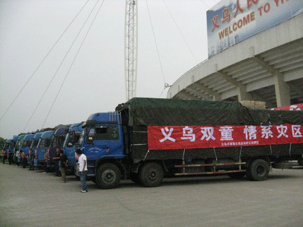 5.12汶川大地震,牽動(dòng)著義烏人民的心尖,抗震救災(zāi),義不容辭。2008年5月30日,在得知綿陽(yáng)災(zāi)區(qū)急需生活用品的消息后,第一時(shí)間內(nèi)由9家生產(chǎn)日用品的義烏企業(yè)主自發(fā)組織了賑災(zāi)活動(dòng),其中義烏市雙童日用品有限公司、義烏市佳潔塑膠有限公司、義烏市安柔為衛(wèi)生用品有限公司、浙江康泰塑業(yè)有限公司、義烏利津日用品有限公司、義烏圣象塑料制品有限公司、義烏市春香日用品廠、義烏市好易日用品有限公司、義烏市一帆日用品有限公司共計(jì)物資達(dá)136萬(wàn)元,包括塑料杯5100箱、大號(hào)垃圾桶1500箱、衛(wèi)生巾400箱、嬰兒尿褲400箱,由義烏梅湖體育館出發(fā),分10車直接發(fā)送四川災(zāi)區(qū)。