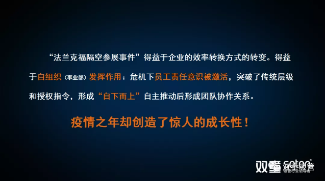 隨后,樓老師通過“法蘭克福隔空參展事件”,讓大家深刻意識到這種機(jī)制催生的巨大活力?!半p童”第三事業(yè)部在2020年2月疫情危機(jī)下,自主經(jīng)營的員工責(zé)任意識被激活,在眾多不利環(huán)境下突破了傳統(tǒng)層級和授權(quán)指令,實現(xiàn)“自下而上”推動后形成了緊密的團(tuán)隊協(xié)作關(guān)系。在眼看參展無望的絕境下竭盡所能,核心成員通過創(chuàng)新方式和遠(yuǎn)程視頻遙控的方式聘請德國慕尼黑工業(yè)大學(xué)的留學(xué)生全程參展,從而獲得了五年以來最好的參展效果,在疫情之年取得了驚人的成長性。