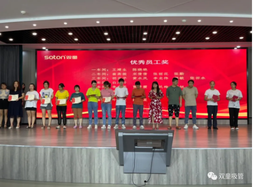 頒獎(jiǎng)環(huán)節(jié)開(kāi)始,由主持人“吸管妞”宣讀第二季度優(yōu)秀員工名單,由“雙童”總經(jīng)理李二橋給他們頒發(fā)了獎(jiǎng)狀和紅包并合影留念。