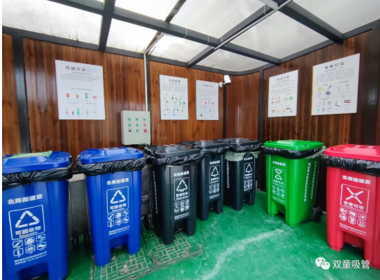 在“雙童”的二期廠房有一間精致漂亮的小木屋。這就是“雙童”的垃圾分類投放房,在這間小木屋內實現(xiàn)了“雙童”兩個廠區(qū)所有生活垃圾的分類和投放工作。每一位員工都會定期將自己的生活垃圾送往這里進行分類投放 。 在“雙童”的垃圾投放房里各有紅綠藍黑等多個顏色的垃圾分類桶,分別將廠區(qū)的生活垃圾分為了易腐垃圾、其他垃圾、可回收物、有害垃圾四大類。如果你仔細觀察,就會發(fā)現(xiàn)“雙童”的投放指南上,還對可回收物中的紙張資源和瓶罐資源進行了細分。