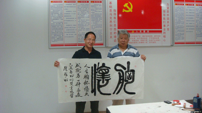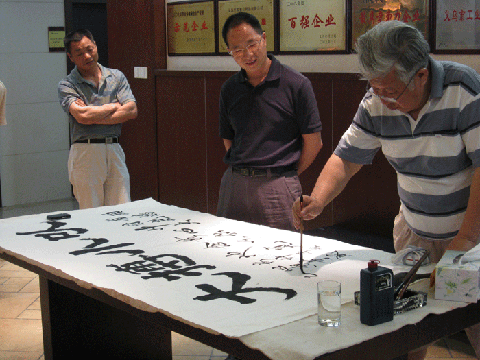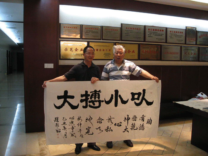 2009年5月12日,國(guó)家一級(jí)美術(shù)師醒醉、原名沈芳(教援),應(yīng)公司董事長(zhǎng)樓仲平先生的邀請(qǐng)來(lái)我司現(xiàn)場(chǎng)揮毫,迎來(lái)眾多書畫愛(ài)好者觀看。大師結(jié)合公司董事長(zhǎng)多年以來(lái)堅(jiān)持的經(jīng)營(yíng)理念和公司產(chǎn)品及企業(yè)文化特點(diǎn),揮筆寫下《以小博大》、《胸懷》和《遠(yuǎn)瞻》等名作,并同樓仲平先生現(xiàn)場(chǎng)合影.