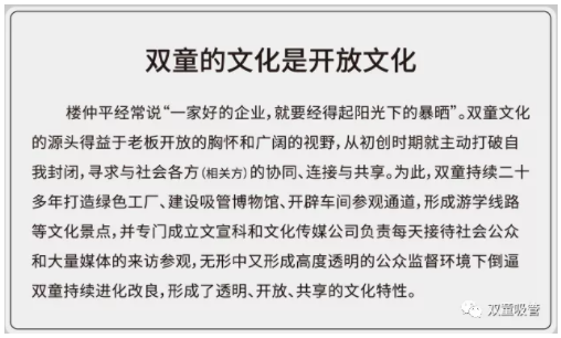 在與大量社會(huì)公眾和媒體的接觸下,“雙童”無(wú)形中又形成了高度透明的公眾監(jiān)督環(huán)境。在這一環(huán)境的倒逼之下,“雙童”持續(xù)進(jìn)行改良,形成了透明、開放、共享的文化特性。