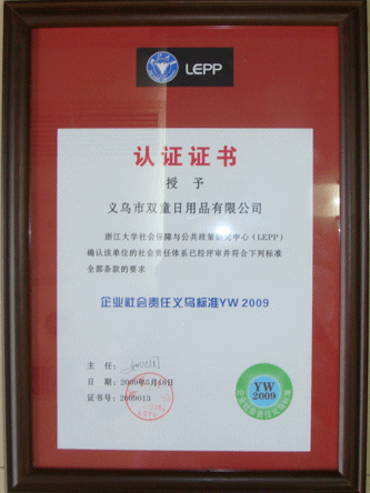 5月22日下午,義烏市總工會(huì)在北苑街道多功能廳舉行由浙江大學(xué)社會(huì)保障與公共政策研究中心(LEPP)確認(rèn)的最具社會(huì)責(zé)任企業(yè)頒獎(jiǎng)儀式,吳森民副市長(zhǎng)出席會(huì)議并作了重要講話。我司經(jīng)評(píng)審符合企業(yè)社會(huì)會(huì)責(zé)任義烏標(biāo)準(zhǔn)YW2009全部條款的要求,并被授予“最具社會(huì)責(zé)任企業(yè)“稱號(hào)。