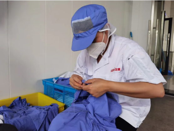 除了清洗,洗衣工也要對工服的質(zhì)量進行檢查,確保工服的穿著感受良好。如果有掉扣子的情況,洗衣工會及時進行縫補;要是工服出現(xiàn)了大面積損壞,則會進行記錄,將其進行報損并統(tǒng)一處理成清洗抹布。