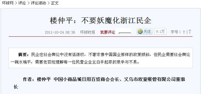 日前,某報(bào)刊登了一篇內(nèi)容為"義烏老板假破產(chǎn)真移民"的長(zhǎng)篇報(bào)道,作者以偏概全的不實(shí)報(bào)道對(duì)義烏民營(yíng)企業(yè)地形象產(chǎn)生了極大的不良影響,對(duì)此,雙童當(dāng)家人樓仲平依據(jù)30多年來對(duì)義烏市場(chǎng)的了解,在《環(huán)球時(shí)報(bào)》上發(fā)表文章《不要妖魔化浙江民企》,澄清義烏民企現(xiàn)狀,抵制不實(shí)報(bào)道,為義烏民企正名。