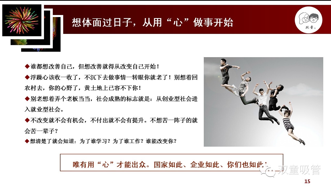 第一部分,董事長(zhǎng)用宏觀的角度給大家講述了中國(guó)制造業(yè)企業(yè)的整個(gè)大環(huán)境發(fā)生的變化以及用工形式,為了讓在座的基層員工們能夠聽(tīng)懂,他選擇了最淺顯易懂的語(yǔ)言來(lái)講述這個(gè)課程,充分利用了數(shù)據(jù)、舉例、比較等形式,讓員工意識(shí)到:唯有用“心”才能出眾。國(guó)家如此、企業(yè)如此、員工也如此!
