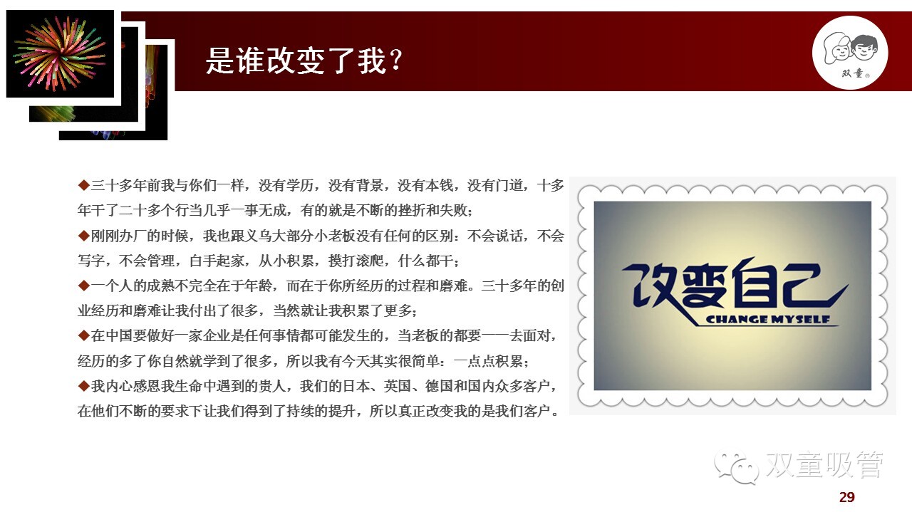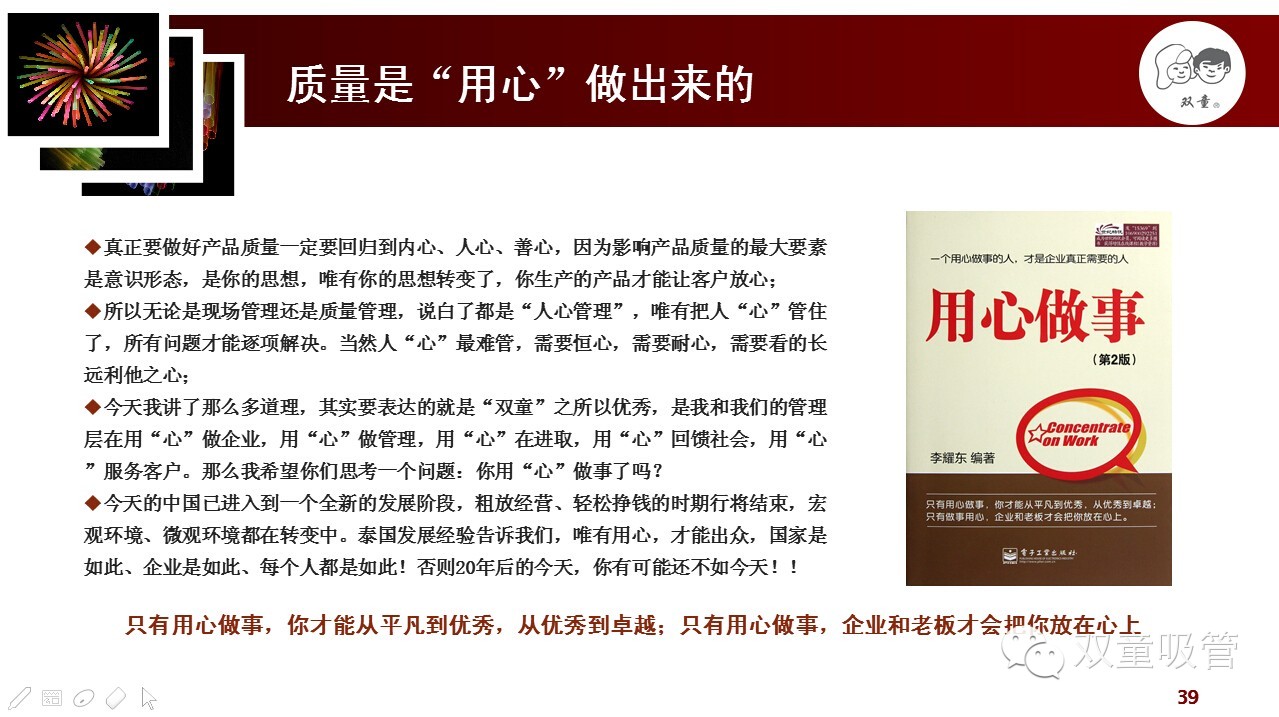第二部分,董事長(zhǎng)延伸到了我們雙童吸管的企業(yè)文化,向員工們講起了他的創(chuàng)業(yè)經(jīng)歷和管理雙童以來(lái)發(fā)生的一些故事。他說(shuō),無(wú)論是現(xiàn)場(chǎng)管理還是質(zhì)量管理,說(shuō)白了都是“人心管理”,唯有把人“心”管住了,所有問(wèn)題才能逐項(xiàng)解決。當(dāng)然人“心”最難管,需要恒心,需要耐心,需要看的長(zhǎng)遠(yuǎn)做更多善待員工的利他之心。