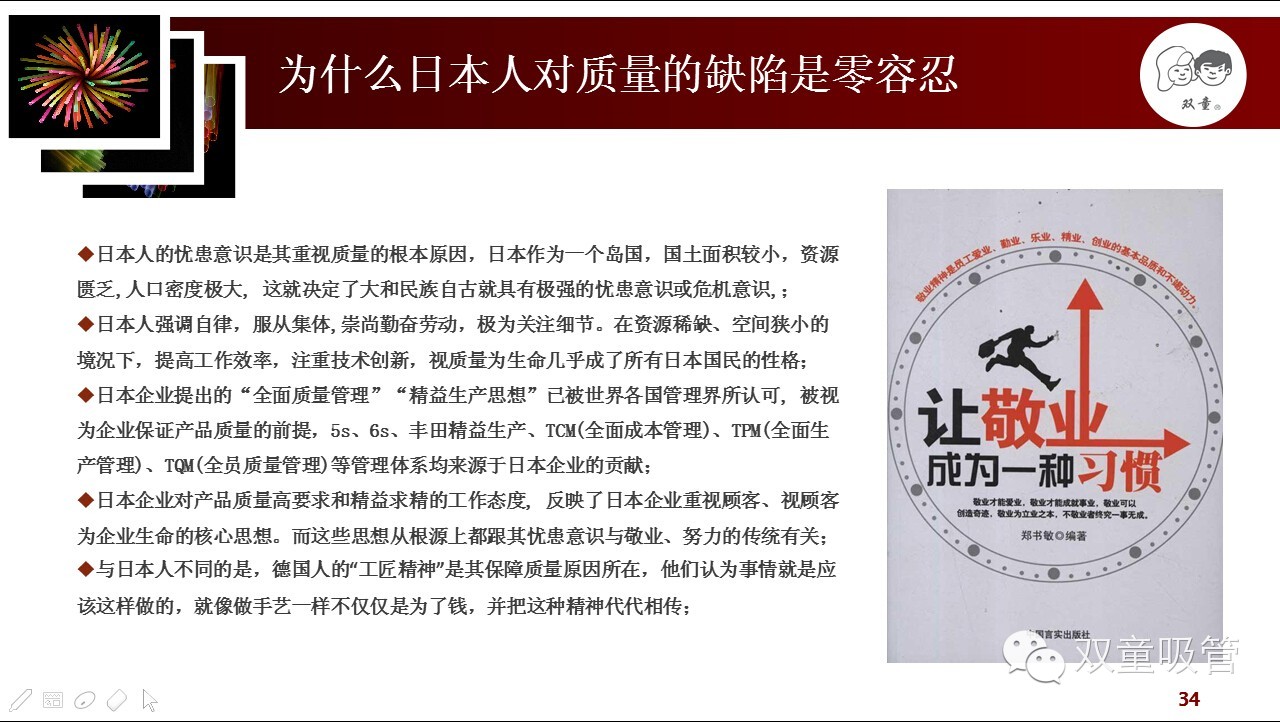 最后的第三部分,自然是課程的重中之重。董事長(zhǎng)賣了這么久的關(guān)子,又是講大環(huán)境又是講企業(yè)發(fā)展和企業(yè)文化,終于還是繞到了“產(chǎn)品質(zhì)量”這個(gè)話題上來(lái)!在講述了雙童數(shù)次和日本客戶打交道之后的故事之后,他引用了陳春花的話說(shuō)明質(zhì)量的重要性:淘汰企業(yè)的一定不是企業(yè)的規(guī)模、不是企業(yè)的技術(shù)、不是企業(yè)的品牌、也不是產(chǎn)品的價(jià)格。淘汰企業(yè)出局的一定是企業(yè)的顧客!唯有顧客才能決定企業(yè)是否能夠繼續(xù)生存!