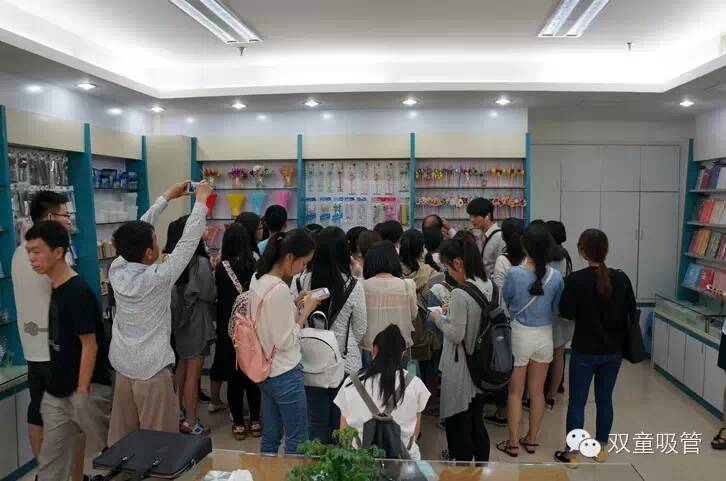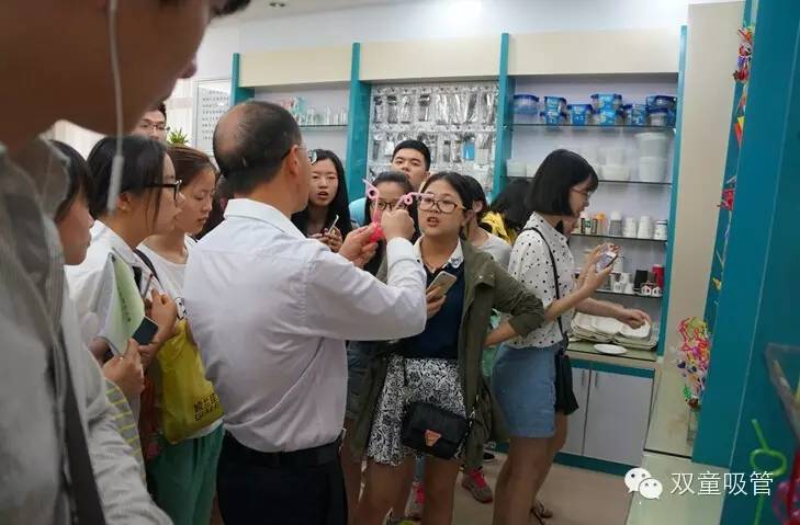 而當(dāng)參觀隊(duì)伍匯總到樣品房時(shí),當(dāng)家人的“導(dǎo)游”講解更加賣力了: “這根吸管埋在土里三個(gè)月就能自行降解,因?yàn)樗怯衩椎矸圩龅??!?“哇!” “這根吸管有二十多個(gè)零配件,有好幾項(xiàng)專利?!?“哇!” 在雙童吸管樣品房里,隨著當(dāng)家人樓總對(duì)產(chǎn)品的介紹,浙師大的妹子們一起發(fā)出的贊嘆不絕于耳!