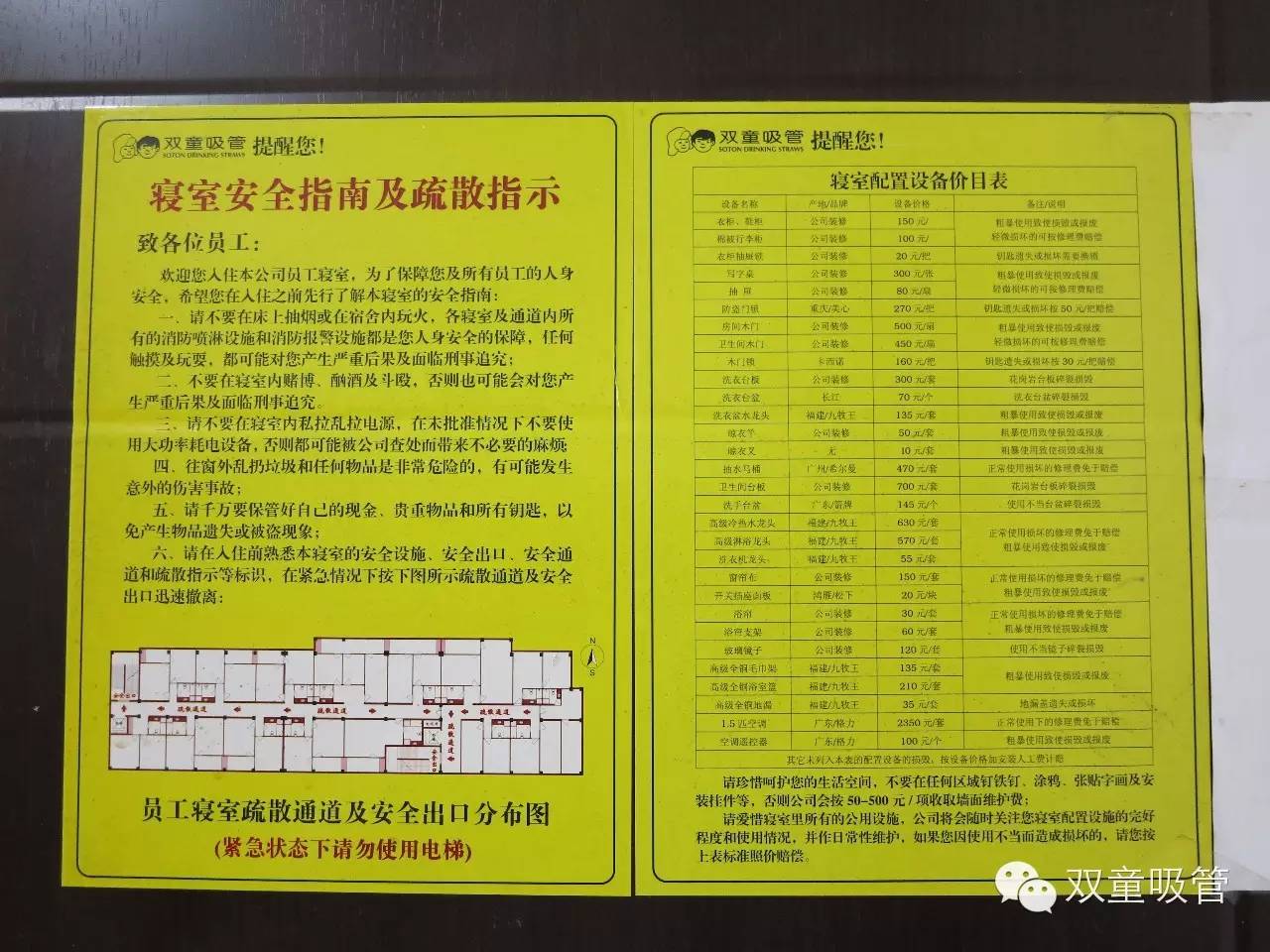 寢室安全指南及疏散指示和寢室配置設備價目表