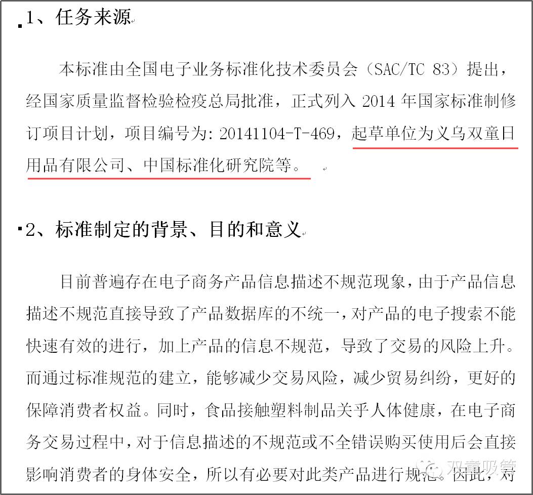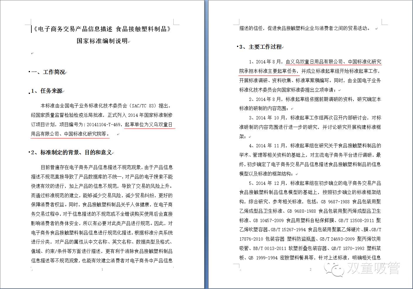 “雙童吸管”從2014年8月開(kāi)始承擔(dān)了全國(guó)電子業(yè)務(wù)標(biāo)準(zhǔn)化技術(shù)委員會(huì)下達(dá)的標(biāo)準(zhǔn)立項(xiàng)工作,會(huì)同中國(guó)標(biāo)準(zhǔn)化研究院成立了標(biāo)準(zhǔn)起草工作小組,逐步開(kāi)展標(biāo)準(zhǔn)調(diào)研、資料收集工作,經(jīng)過(guò)大量前期調(diào)研,在研究關(guān)于食品接觸塑料制品的學(xué)術(shù)、管理等相關(guān)資料的基礎(chǔ)上,對(duì)主流電子商務(wù)平臺(tái)進(jìn)行了歷次調(diào)研,最終初步確定了電子商務(wù)交易產(chǎn)品信息描述食品接觸塑料制品的信息模型以及標(biāo)準(zhǔn)的框架結(jié)構(gòu),于2014年底形成了標(biāo)準(zhǔn)討論稿,繼而在收集積累過(guò)程中不斷完善、改進(jìn)和提升,三易其稿,逐步在2015年5月形成了標(biāo)準(zhǔn)的征求意見(jiàn)稿,并在全國(guó)電子業(yè)務(wù)標(biāo)準(zhǔn)化技術(shù)委員會(huì)的組織下于2015年11月在北京召開(kāi)了標(biāo)準(zhǔn)征求意見(jiàn)會(huì),邀請(qǐng)相關(guān)的行業(yè)專家針對(duì)標(biāo)準(zhǔn)內(nèi)容提出相關(guān)的修改意見(jiàn)和建議,并于2016年3月2日在中國(guó)標(biāo)準(zhǔn)化研究院舉行并完成了《電子商務(wù)交易產(chǎn)品信息描述 食品接觸塑料制品》國(guó)家標(biāo)準(zhǔn)的審定工作。