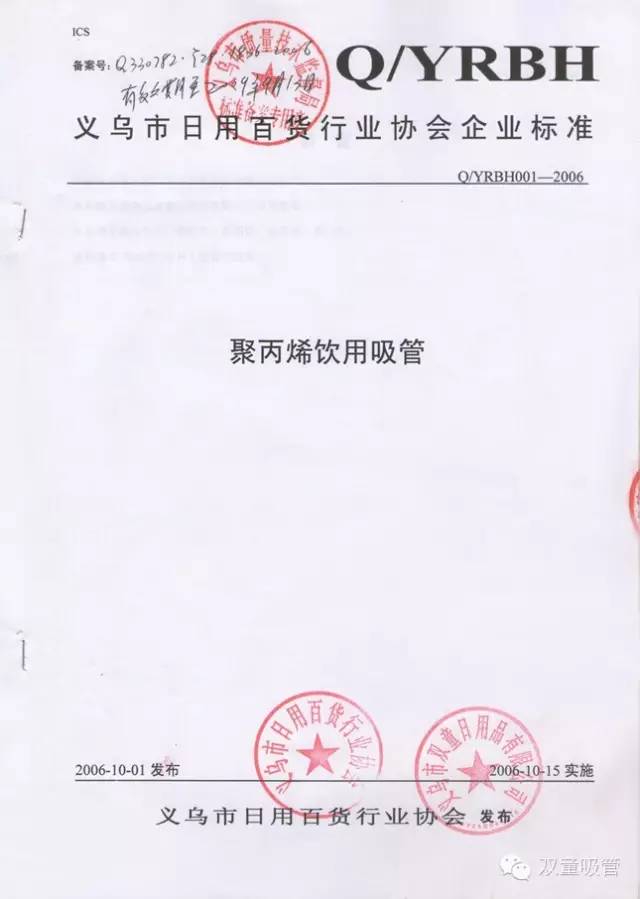 2006年9月,雙童完成了《聚丙烯飲用吸管》和《一次性塑料飲用杯》行業(yè)標(biāo)準(zhǔn)的起草編制工作,成為了當(dāng)時(shí)義烏歷史上第一件行業(yè)標(biāo)準(zhǔn)!