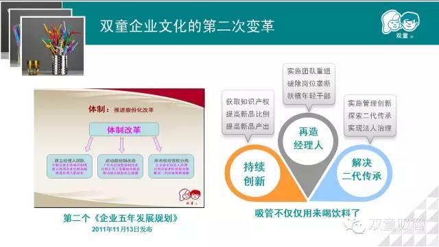 2011年“雙童吸管”開(kāi)始做第二個(gè)五年規(guī)劃,通過(guò)產(chǎn)品創(chuàng)新、團(tuán)隊(duì)再造、體制改革三個(gè)方面進(jìn)行發(fā)展。
