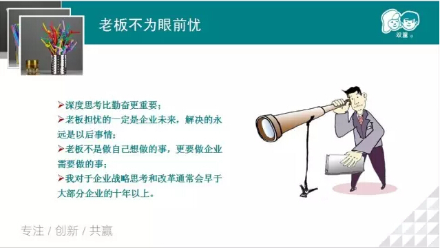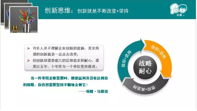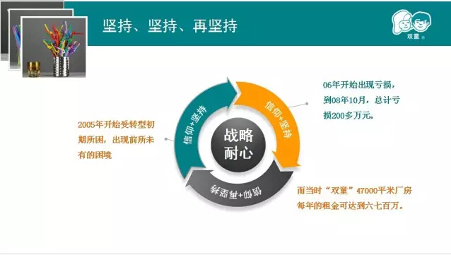我們強(qiáng)調(diào)戰(zhàn)略思考、戰(zhàn)略規(guī)劃、戰(zhàn)略部署,唯獨(dú)缺少戰(zhàn)略內(nèi)心。2005、2006、2007年雙童連續(xù)三年虧損,但是雙童堅(jiān)持小客戶原則,堅(jiān)持對(duì)員工投入,堅(jiān)持走差異化的道路,雙童的發(fā)展也越來(lái)越好。有人說(shuō)創(chuàng)新太難了,要去發(fā)明;也有人說(shuō)創(chuàng)新太難了,要去顛覆。創(chuàng)新,沒(méi)有那么復(fù)雜,微創(chuàng)新、局部改良都是創(chuàng)新。創(chuàng)新就是改變,就是持續(xù)積累。