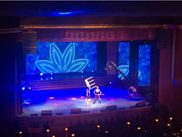 晚會在大合唱《咱們工人有力量》中拉開序幕。配樂詩朗誦、舞蹈、歌曲、樂器獨奏紛紛上臺表演,由國家一級演員張艷、大剛表演的雜技《足尖上的藝術(shù)》,把我們“雙童”的壽星們可都看驚呆了!