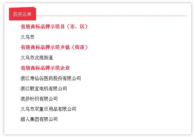 2005年之后分別獲“浙江省著名商標”、“浙江省名牌產(chǎn)品”、“浙江省知名商號”和“浙江省綠色企業(yè)”等省級榮譽稱號