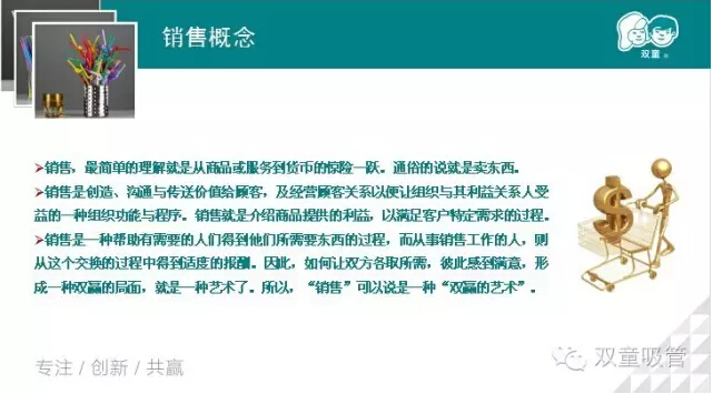 其實(shí)銷售除了通俗意義上理解的賣東西,實(shí)施起來(lái)其實(shí)也包括很多方面!除了接單、下單、跟單、發(fā)貨、收款,還要進(jìn)行客戶維護(hù)、產(chǎn)品推廣等工作??梢?jiàn)要把銷售工作做精做好也著實(shí)不容易呢!