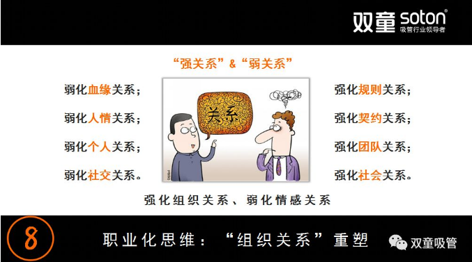 做“家族企業(yè)”還是家里的企業(yè)?其實(shí),兩者之間的界限就在于是否規(guī)范經(jīng)營,這一點(diǎn)在“雙童”的關(guān)系哲學(xué)的“強(qiáng)關(guān)系與弱關(guān)系”中也有體現(xiàn)。弱化血緣關(guān)系,強(qiáng)化規(guī)則關(guān)系;弱化人情關(guān)系,強(qiáng)化契約關(guān)系;弱化個(gè)人關(guān)系,強(qiáng)化團(tuán)隊(duì)關(guān)系;弱化社交關(guān)系,強(qiáng)化社會(huì)關(guān)系。
