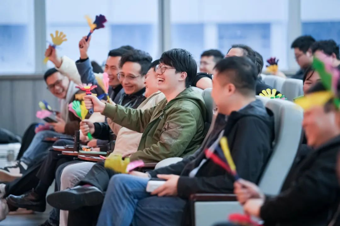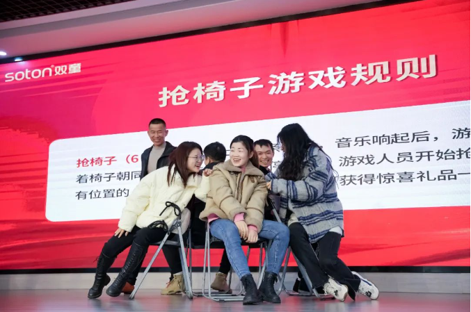 新年祝福視頻過后,現(xiàn)場的喜慶氛圍在一首歌曲表演下達(dá)到了頂峰。由文宣團(tuán)隊(duì)帶來的經(jīng)典歌曲《相親相愛一家人》,這一耳熟能詳?shù)母枨尨蠹叶家黄饟]起手來加入了合唱。伴隨著動人的音樂,背景短片還帶現(xiàn)場所有“雙童人”一起重溫了2022年的溫情瞬間,無論是車間一線生產(chǎn)人員的暖陽般的微笑,還是銷售人員拿著銷冠獎(jiǎng)杯的喜悅,都一一呈現(xiàn)。回顧這一年,可謂是真正的大豐收!