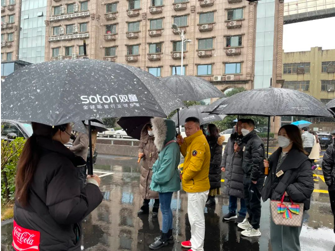 2020年4月,“雙童”董事長樓仲平注意到,下雨天總會有不少員工,因為忘記帶傘而被困在廠房和食堂里,無法出行,這樣不僅耽誤行程、影響工作進度,冒雨而行還可能對健康不利。為此,樓仲平讓后勤部門定制了第一批流動雨傘,在一、二期廠房和宿舍樓下投入使用。