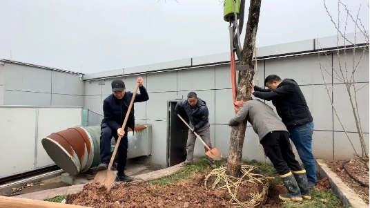 在空中花園里,大家嘿呦嘿呦的正在賣力地栽樹。俗話說得好,團結就是力量,大家一起培土、踩實、澆水,每道工序都一絲不茍,每個流程認真細致!