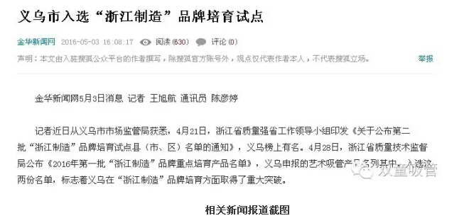 2014年底,浙江在全國率先以標(biāo)準(zhǔn)和認證為手段打造首個區(qū)域性公共品牌——“浙江制造”品牌。“浙江制造”標(biāo)準(zhǔn)比國家及行業(yè)標(biāo)準(zhǔn)要求更高,達到國際先進、國內(nèi)一流水平。4月28日,浙江省質(zhì)量技術(shù)監(jiān)督局公布《2016年第一批“浙江制造”品牌重點培育產(chǎn)品名單》,我們“雙童”代表義烏申報的吸管產(chǎn)品名列其中。標(biāo)志著義烏在“浙江制造”品牌培育方面取得了重大突破。