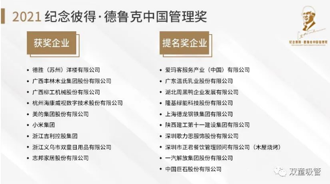 “雙童”三十年保持活力的源頭,就在于“小客戶原則”下企業(yè)核心競(jìng)爭(zhēng)力的變化。目前,“小客戶原則”被收錄在國(guó)家案例庫(kù)里。在管理實(shí)踐中,“雙童”越來(lái)越能夠把握住企業(yè)特色,將經(jīng)營(yíng)哲學(xué)融入進(jìn)企業(yè)管理,并進(jìn)行開拓創(chuàng)新,由此產(chǎn)生了越來(lái)越多經(jīng)典管理案例。2021年,“雙童”榮獲“德魯克管理獎(jiǎng)”,成為中國(guó)唯一一家獲得該項(xiàng)榮譽(yù)的中小企業(yè)。
