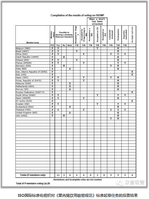 2008年7月,雙童在完成《聚丙烯飲用吸管》行業(yè)標(biāo)準(zhǔn)、國家標(biāo)準(zhǔn)的起草編制任務(wù)后,向ISO標(biāo)準(zhǔn)化管理組織申請了國際標(biāo)準(zhǔn)的起草制定任務(wù)。四年后,中國、泰國、瑞典、法國、南非五國組成的《聚丙烯飲用吸管規(guī)范》國際標(biāo)準(zhǔn)起草委員會成立。
