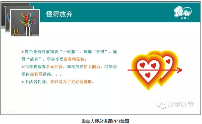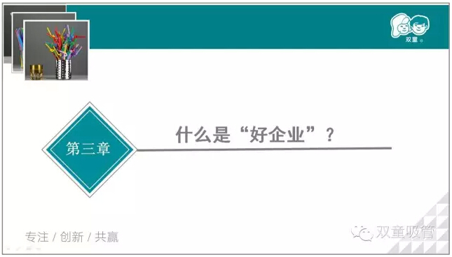 恒心則需要有以10年為單位的戰(zhàn)略耐心。以博大的胸懷把一件事情做好。當(dāng)家人說,”雙童“的創(chuàng)新工作都是以十年為一個單位來進行。而當(dāng)家人自己則是”老板不解眼前憂“,培養(yǎng)專業(yè)的經(jīng)理人團隊去解決企業(yè)問題,自己把目光放長遠,每五年做一次“五年規(guī)劃”。