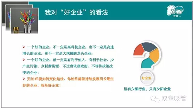 何為好企業(yè)?當(dāng)家人樓總和大家分享:“別人好,你好;別人不好,你還好!”做一個好企業(yè)一定要有利于他,有利于社會。少浪費資源,少產(chǎn)生污染,不過分依靠政府,不等待政府變化。一定要創(chuàng)造價值,無論環(huán)境如何變化起伏,始終都能持續(xù)發(fā)展,長期生存!