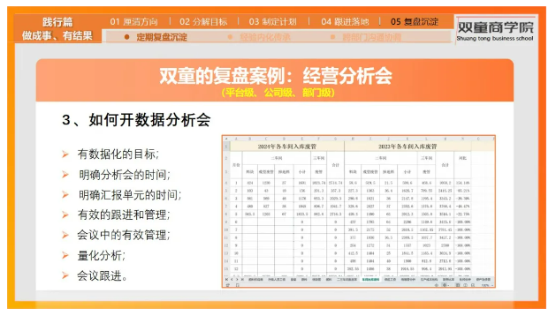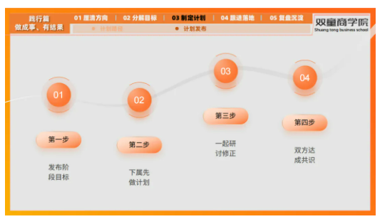 考慮到目標(biāo)分解中可能會遇到的問題,如員工不配合,目標(biāo)分配不公平,李二橋老師也根據(jù)雙童的案例,給出相應(yīng)的解決方案。 ③ 制定計(jì)劃 一個好的計(jì)劃 ,勝過一百次的盲目行動。 雙童“自下而上”制定計(jì)劃的方式,為學(xué)員們提供了很好的范本: