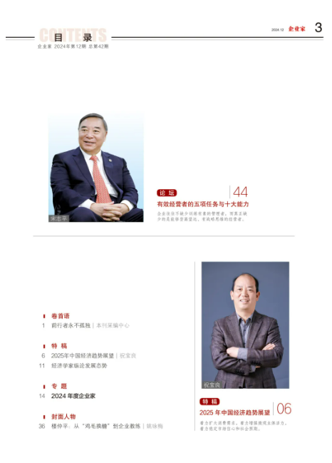 值此歲末年初,《企業(yè)家》雜志重磅推出“2024年度企業(yè)家”專題,誠邀權威專家學者、業(yè)內資深人士共同推舉并撰寫推薦語,旨在發(fā)掘過去一年中在戰(zhàn)略布局、創(chuàng)新能力、企業(yè)成長、市場影響力、社會責任等多個維度表現(xiàn)卓越的二十位企業(yè)家(以姓氏筆畫為序)。
