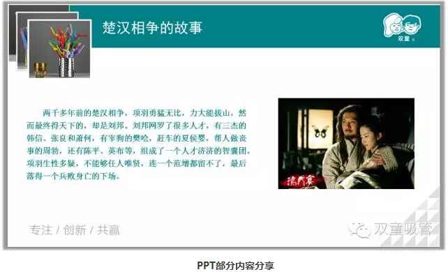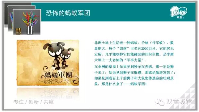 在進行了游戲互動之后,我們的課程也正式開始啦!何為團隊力量?接下來吸管妞通過恐怖的螞蟻軍團和楚漢相爭的兩個小故事和我們講解了團隊的力量。與伙伴精誠協(xié)作,才能變得更強大。