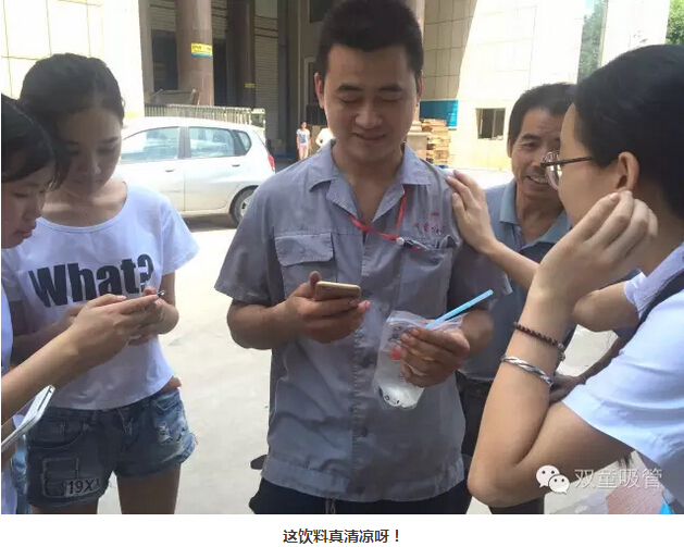 瞧!我們剛開張,就吸引了不少正要去吃飯的員工們。原來,拿到飲料的方法特別簡單,只需要關(guān)注“雙童吸管”的微信公眾平臺并轉(zhuǎn)發(fā)微信,即可獲得檸檬氣泡水一袋呢!看來吸管妞為了微信的推廣也是絞盡腦汁啦!