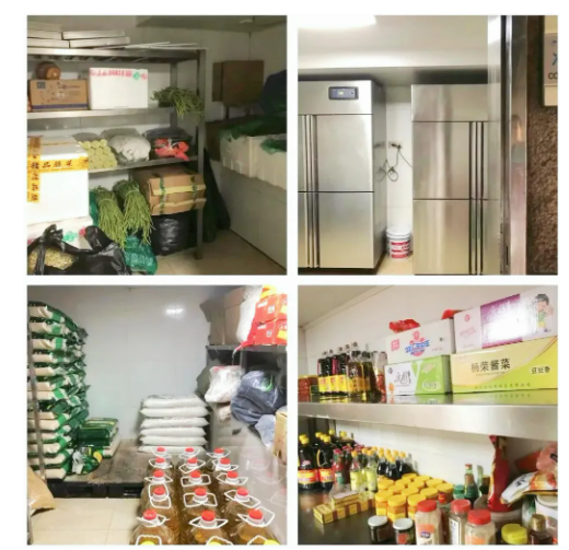 其中采購(gòu)入庫(kù)的魚、肉等易腐爛變質(zhì)的葷菜必須分區(qū)妥善保存在冰箱中,新鮮蔬菜與米、面等主食原料分開存放;除了常規(guī)的食材分開存放外,食用油、大米、面粉、面條、調(diào)味料等食材消耗品,進(jìn)行分類、分架、隔墻、離地存放。