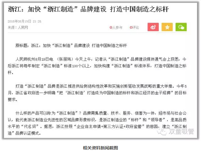 在2014年年底,浙江在全國率先以標(biāo)準(zhǔn)和認(rèn)證為手段打造首個(gè)區(qū)域性公共品牌——“浙江制造”品牌。“浙江制造”標(biāo)準(zhǔn)比國家及行業(yè)標(biāo)準(zhǔn)要求要高,基本達(dá)到國際先進(jìn)、國內(nèi)一流水平。4月28日,浙江省質(zhì)量技術(shù)監(jiān)督局公布《2016年第一批“浙江制造”品牌重點(diǎn)培育產(chǎn)品名單》,我們“雙童”代表義烏申報(bào)的吸管產(chǎn)品名列其中。入選這份名單,標(biāo)志著義烏在“浙江制造”品牌培育方面取得了重大突破。