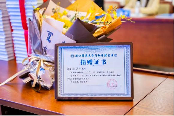 頒獎(jiǎng)儀式結(jié)束后,浙江師范大學(xué)行知學(xué)院舉行了“書(shū)香傳情,智匯未來(lái)”圖書(shū)捐贈(zèng)儀式。儀式上,學(xué)院圖書(shū)館館長(zhǎng)吳建軍、浙江師范大學(xué)行知學(xué)院副院長(zhǎng)蔣芬君共同代表學(xué)校,接受樓仲平捐贈(zèng)的300本個(gè)人自傳《韌商》,并向他頒發(fā)捐贈(zèng)證書(shū)。校方表示,這些書(shū)籍將部分上架供師生借閱,部分用于院史館展出和地方特藏庫(kù)珍藏,以期充分發(fā)揮其傳播與珍藏價(jià)值。一時(shí)間,現(xiàn)場(chǎng)掌聲如潮,氣氛熱烈。