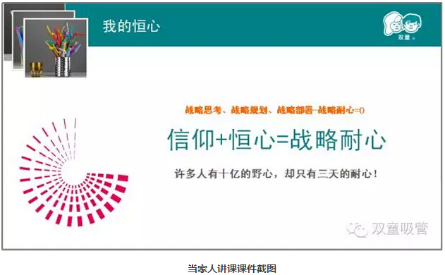 接下來(lái)就是我們的當(dāng)家人樓總的分享時(shí)間啦!本次樓總的演講主題是《隱形冠軍背后的“匠人思維”》,由于時(shí)間關(guān)系,樓總把原本需要半天講完的課程壓縮到了45分鐘,精煉地介紹了“雙童”的人本經(jīng)營(yíng)理念和在企業(yè)經(jīng)營(yíng)過(guò)程當(dāng)中他認(rèn)為要堅(jiān)持的三顆心:初心、恒心、平常心,講述了他如何22年堅(jiān)持只做一根吸管,靠一根吸管打天下的背后故事。演講過(guò)程中,樓總坦言要把“雙童”做成百年老店的豪言也得到了大家一致的掌聲和鼓勵(lì)。