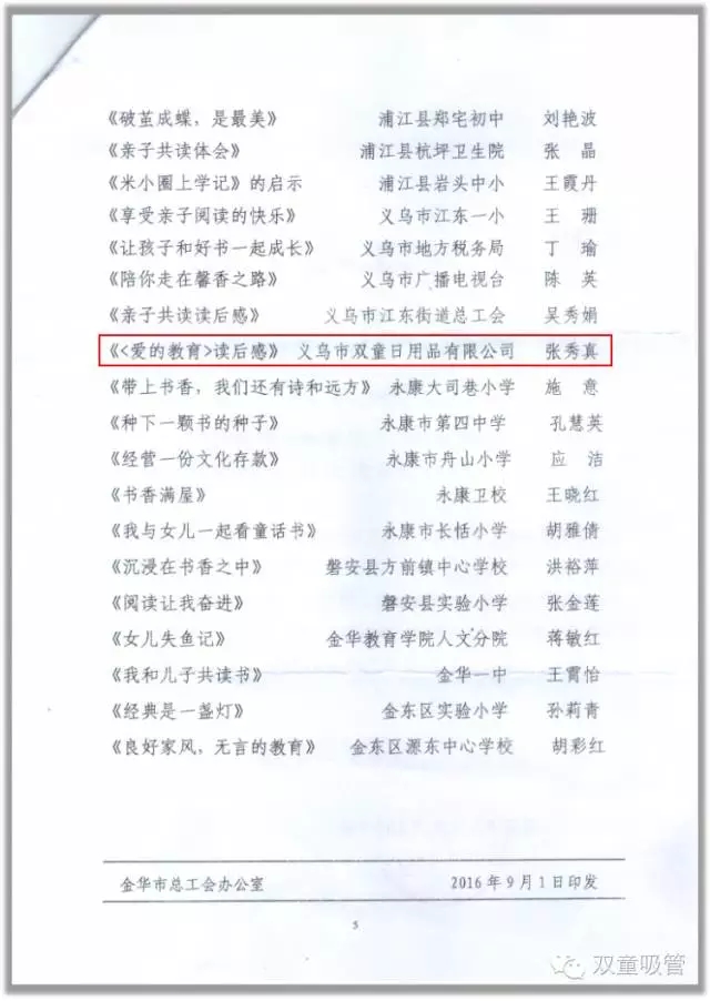 不過,好消息還沒結(jié)束!沒過多久,這篇讀后感又被作為優(yōu)秀作品,參選了金華總工會的比賽評選,并獲得了優(yōu)秀獎呢!吸管妞仔細看了一下,沒想到“雙童”竟然是所有60家獲獎單位里唯一一家企業(yè)單位呢!要知道,參加這類比賽并且獲獎的基本上可都是各大學校和事業(yè)單位?。∥覀兊?/span>“雙童”寶貝是不是很棒呢!下面妞就把這篇讀后感放上來和大家共享,一起和孩子感受“愛的教育”吧!
