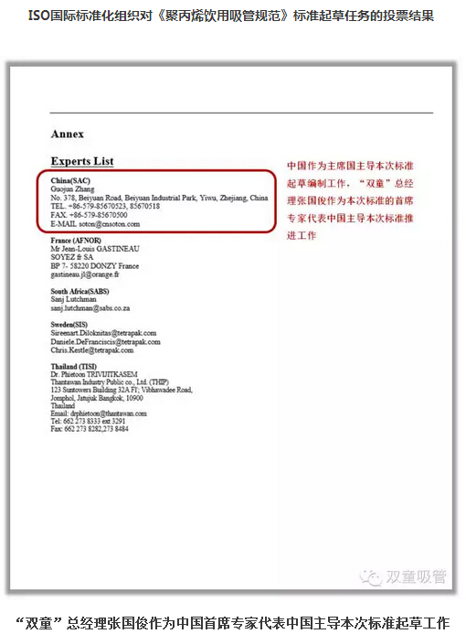 通過四年時間的努力,ISO國際標準化組織于2012年6月8日對《聚丙烯飲用吸管規(guī)范》ISO國際標準的起草編制工作進行投票表決,并以三分之二的絕對多數(shù)獲得通過,并批準以中國、泰國、瑞典、法國、南非5國組成的《聚丙烯飲用吸管規(guī)范》國際標準起草委員會,“雙童”作為當時全球最專業(yè)的吸管制造企業(yè)被推舉為本項國際標準的起草主席國以推進本項標準的起草編制工作。