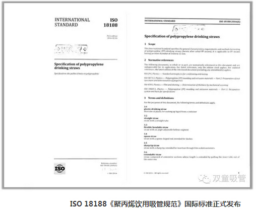 2016年6月27日,瑞士ISO標準化管理組織正式向全球162個成員國下發(fā)了《聚丙烯飲用吸管規(guī)范》ISO國際標準文本。至此,歷經(jīng)九年,輾轉(zhuǎn)六國,由“雙童”代表中國主持起草的《聚丙烯飲用吸管規(guī)范》ISO國際標準終于大功告成!標準起草編制工作圓滿完成。