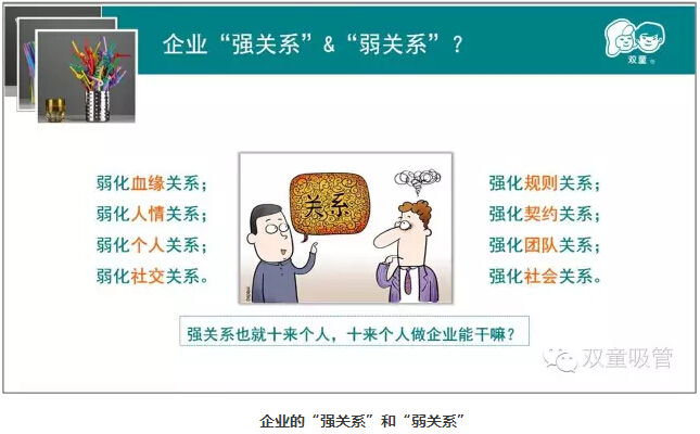 我們要弱化人情關(guān)系,強(qiáng)化契約關(guān)系:在“雙童”,我們盡量減少人情上的關(guān)系,把工作以契約的形式加以固定,這樣也少了許多復(fù)雜的人情困擾。