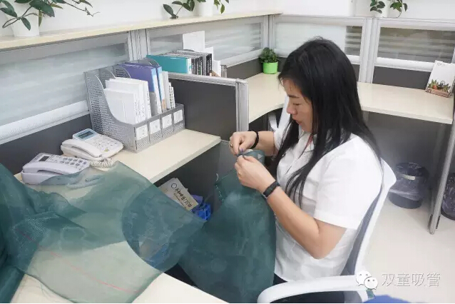 為此,我們的辦公室還發(fā)掘出了一批“繡娘”呢!辦公室的女同胞們?cè)谖苕さ慕M織下,全都手工縫制起了用于裝置活性炭的細(xì)網(wǎng)袋子!2016年最新款“雙童”手工袋,全球限量發(fā)行,你值得擁有!
