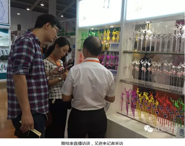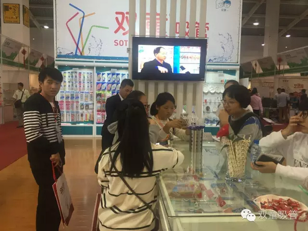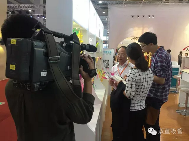 經(jīng)過雙童經(jīng)過的客商基本都會留下腳步。原來是雙童展位的正中央掛著一臺大尺寸的電視機(jī),不間斷的滾動播放當(dāng)家人接受的各類節(jié)目采訪,以及各類媒體對雙童吸管進(jìn)行報道的視頻!看來咱們當(dāng)家人的魅力還真是大呀!