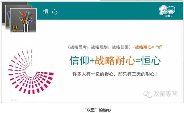 “恒心”是用長(zhǎng)遠(yuǎn)的眼光去看問(wèn)題,我們強(qiáng)調(diào)戰(zhàn)略思考、戰(zhàn)略規(guī)劃、戰(zhàn)略部署,唯獨(dú)缺少戰(zhàn)略耐心。“雙童”堅(jiān)持小客戶原則,堅(jiān)持對(duì)員工投入,堅(jiān)持走差異化的道路,“雙童”的發(fā)展也越來(lái)越好。創(chuàng)新就是改變,就是持續(xù)積累。創(chuàng)新需要戰(zhàn)略耐心,需要十年為一個(gè)單位的恒心。