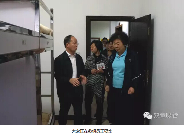 既然是婦聯(lián)領(lǐng)導(dǎo),大家對“雙童”員工們的生活環(huán)境都十分關(guān)心。這不,參觀的下一站就是我們的員工寢室啦!當(dāng)家人樓總向大家介紹我們的寢室。每個房間都配有干凈整潔的洗手間、寬敞明亮的洗衣陽臺,并配有各種家具,每個房間安裝有空調(diào),24小時供應(yīng)熱水洗澡和純凈飲用系統(tǒng)。同時,我們還組建了物業(yè)團(tuán)隊全方面的為員工進(jìn)行服務(wù)。