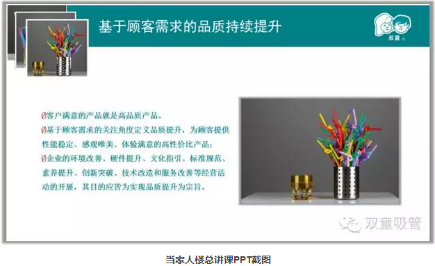 首先,當(dāng)家人樓總對(duì)“雙童”過(guò)去的五年發(fā)展規(guī)劃,及“雙童”發(fā)展前后十年進(jìn)行了對(duì)比與總結(jié)。2005年,“雙童”提出了第一個(gè)五年發(fā)展規(guī)劃,其中提到了三個(gè)關(guān)鍵詞“專注發(fā)展”、“創(chuàng)新提升”、“資源最大化”,在這期間,“雙童”始終堅(jiān)持以小博大的理念,沒有貪大求全,急功近利,專注做好一根吸管。