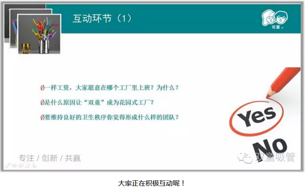 這不,一開(kāi)場(chǎng)當(dāng)家人就讓妞發(fā)起了紅包福利,在看到“雙童”與一般企業(yè)的餐廳、寢室等硬件的對(duì)比之后,互動(dòng)真是停不下來(lái)啦!一樣工資的情況下,大家愿意在哪個(gè)工廠上班?要維持良好的衛(wèi)生秩序你覺(jué)得要形成什么樣的團(tuán)隊(duì)?