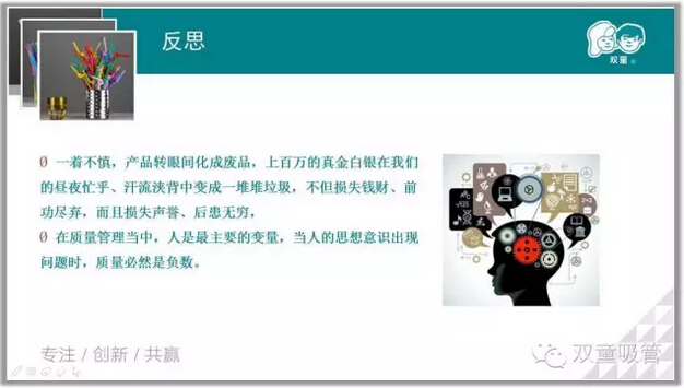 一著不慎,產品轉眼間化成廢品,上百萬的真金白銀在我們的晝夜忙乎、汗流浹背中變成一堆堆垃圾,不但損失錢財、前功盡棄,而且損失聲譽、后患無窮,在質量管理當中,人是最主要的變量,當人的思想意識出現(xiàn)問題時,質量必然是負數(shù)。我們的員工更應該轉變思維意識,杜絕“差不多”思想,從細節(jié)開始做起!